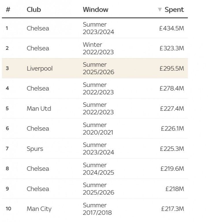 根據(jù)Sky Sports統(tǒng)計(jì),利物浦在英超聯(lián)賽的歷史支出列表中排名第三,小于切爾西的2022-23冬季窗口和2023-24夏季窗口。